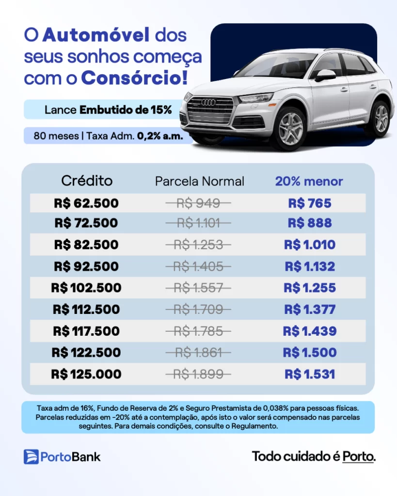 Consórcio de veículos Porto Seguro sem juros e sem entrada. Parcelas até 20% menores. Simule grátis sua proposta personalizada agora.